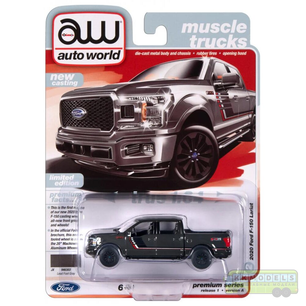 Технические характеристики 1:64 Масштабная модель Auto World 2020 Ford F-150 Lariat FX4 Pickup Truck Lead Foot Gray